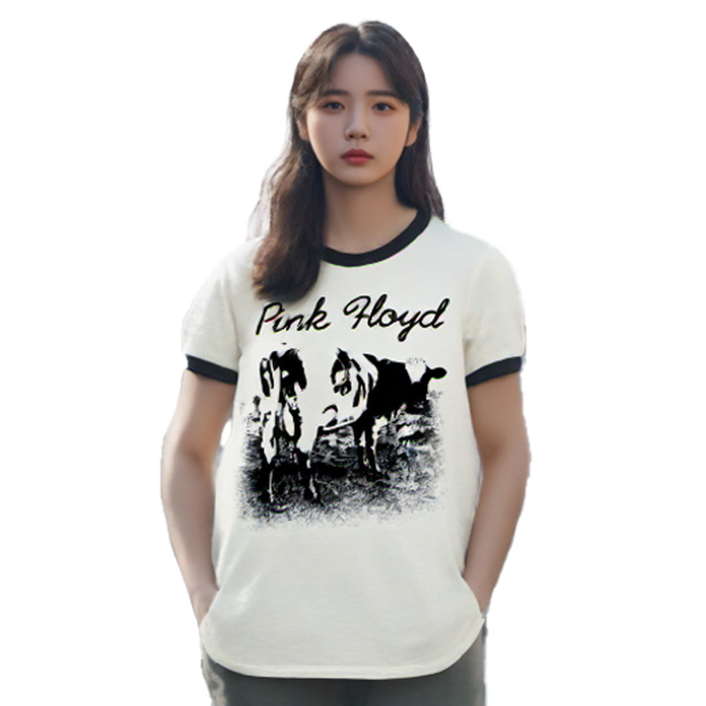 1970年にリリースされたPink Floydの5thアルバム『Atom Heart Mother』のアートワークをフィーチャーした、公式ライセンスのリンガーTシャツ。