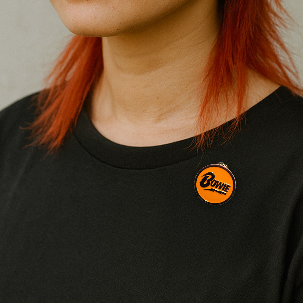 David Bowieのブランドロゴを円形にあしらった、公式ライセンスのピンバッジ。