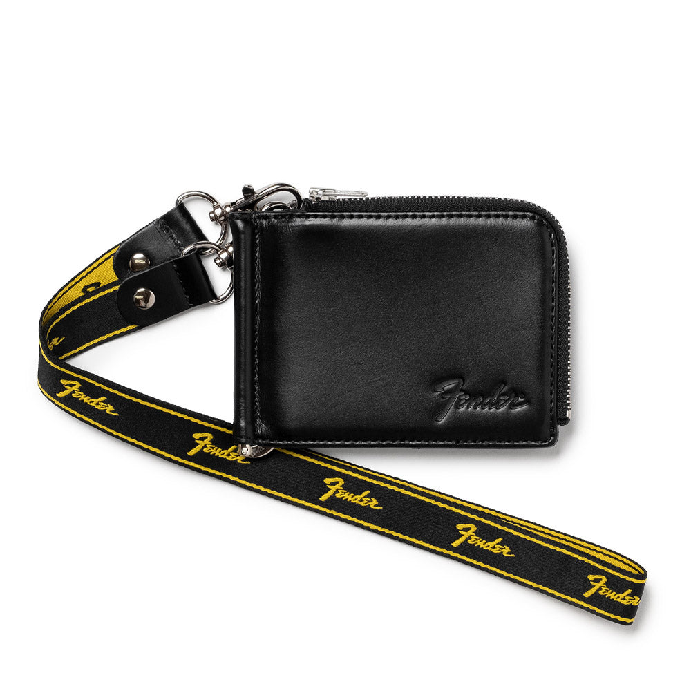 FenderのストラップをイメージしたウォレットコードとFenderのギターピックが付属し、ギターピックは収納可能。