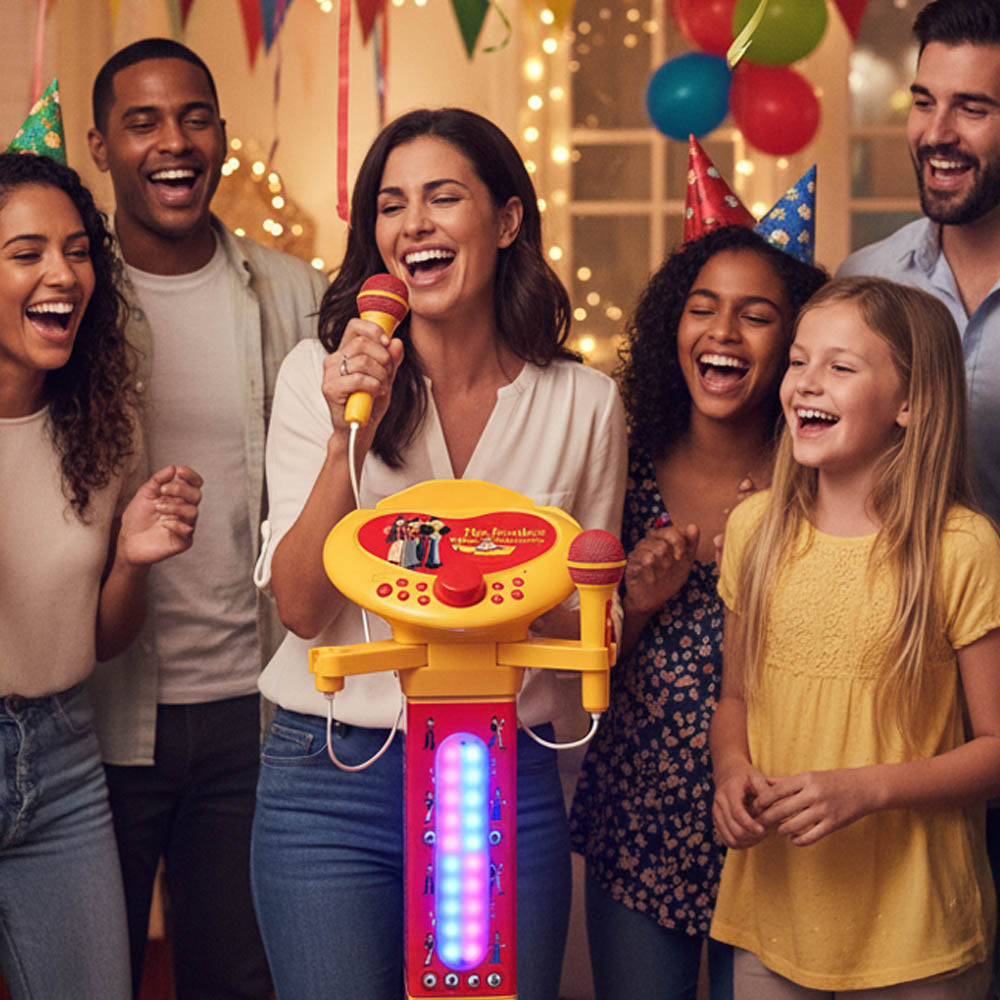 お子様のことを考えて特別に設計され、丈夫で子供に安全なカラフルなプラスチックで作られたこの頑丈で軽量、持ち運びやすく高さ調節可能なシステムは、卓上モデルと同じ優れた仕様で、すぐにパーティー気分を盛り上げます。