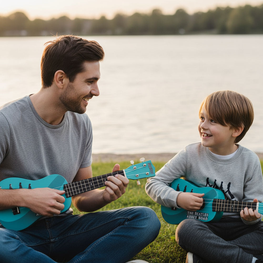 本作「Abbey Road」は、名盤ジャケットの横断歩道シーンを鮮やかなターコイズブルーのボディに描いた、ファン必携のデザインです。